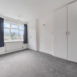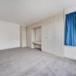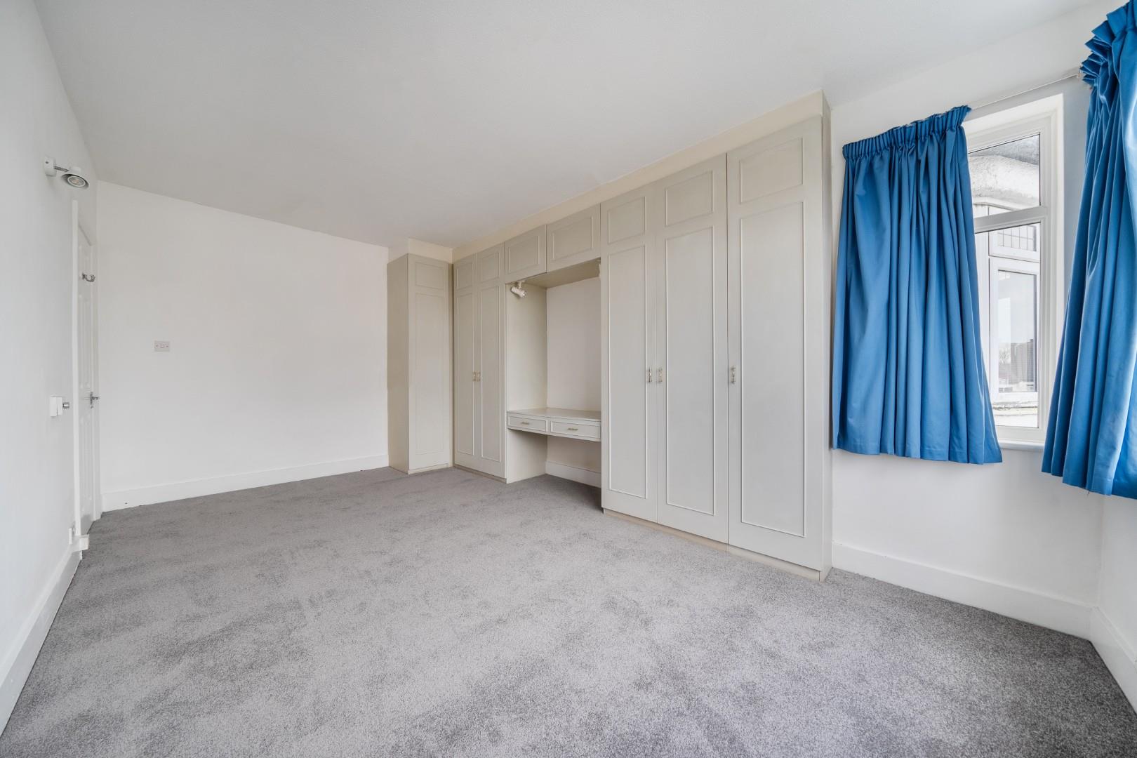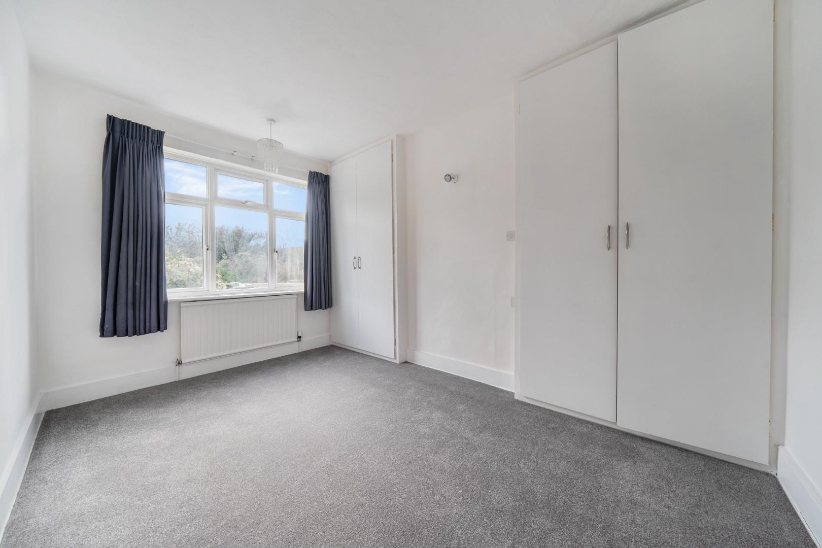 Bedroom two is a large, airy room boasting a wide front-facing window and fitted wardrobes with a dressing table area. The soft grey carpet and neutral walls create a relaxing space with plenty of natural light.