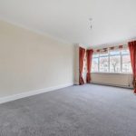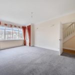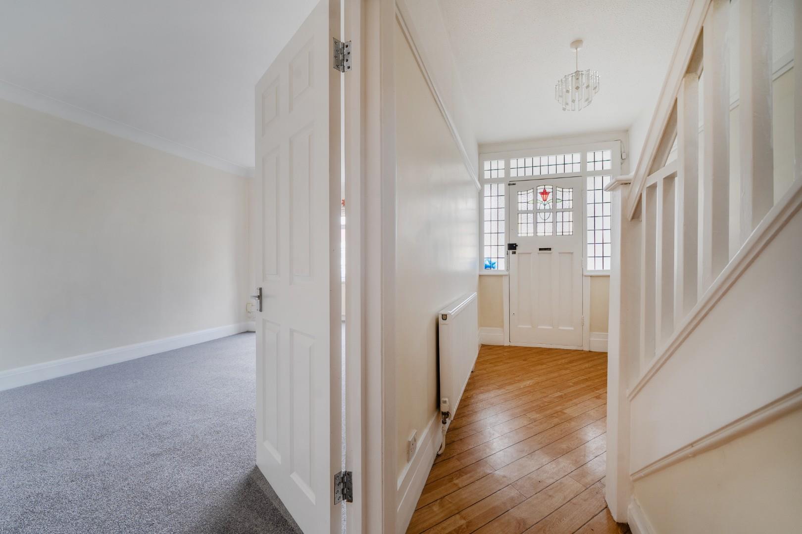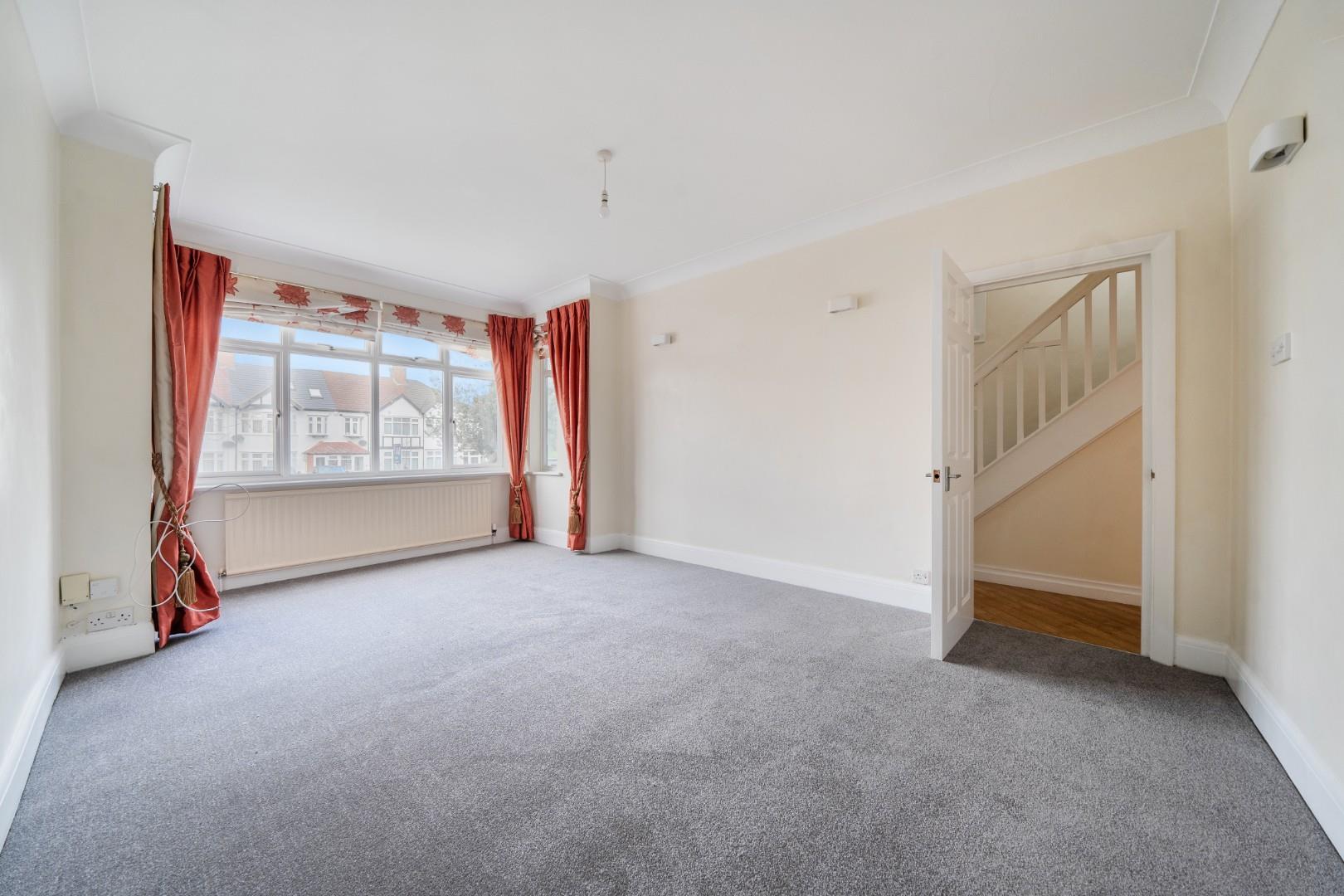 Spacious and filled with natural light from a wide front-facing window, the reception room features a neutral carpet and cream walls, creating a calm and inviting atmosphere. It connects directly to the hall and provides a comfortable space for relaxing or entertaining guests.