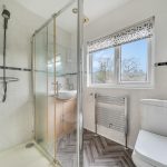 The Ensuite Shower Room attached to Bedroom 1 is bright and practical, with a corner shower, toilet, and washbasin set into a wooden cabinet. A window allows natural light to filter in, enhancing the fresh, airy feel of the space.