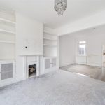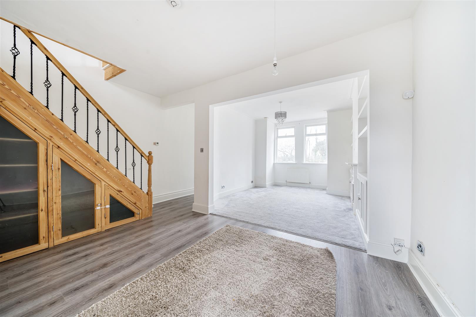 This welcoming reception room is bright and airy, featuring a bay window that floods the space with natural light. Built-in shelves and storage cabinets flank a charming fireplace, creating a cosy focal point. The room connects smoothly to the dining area, offering a versatile space for relaxing or entertaining.