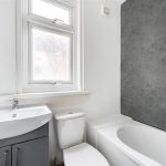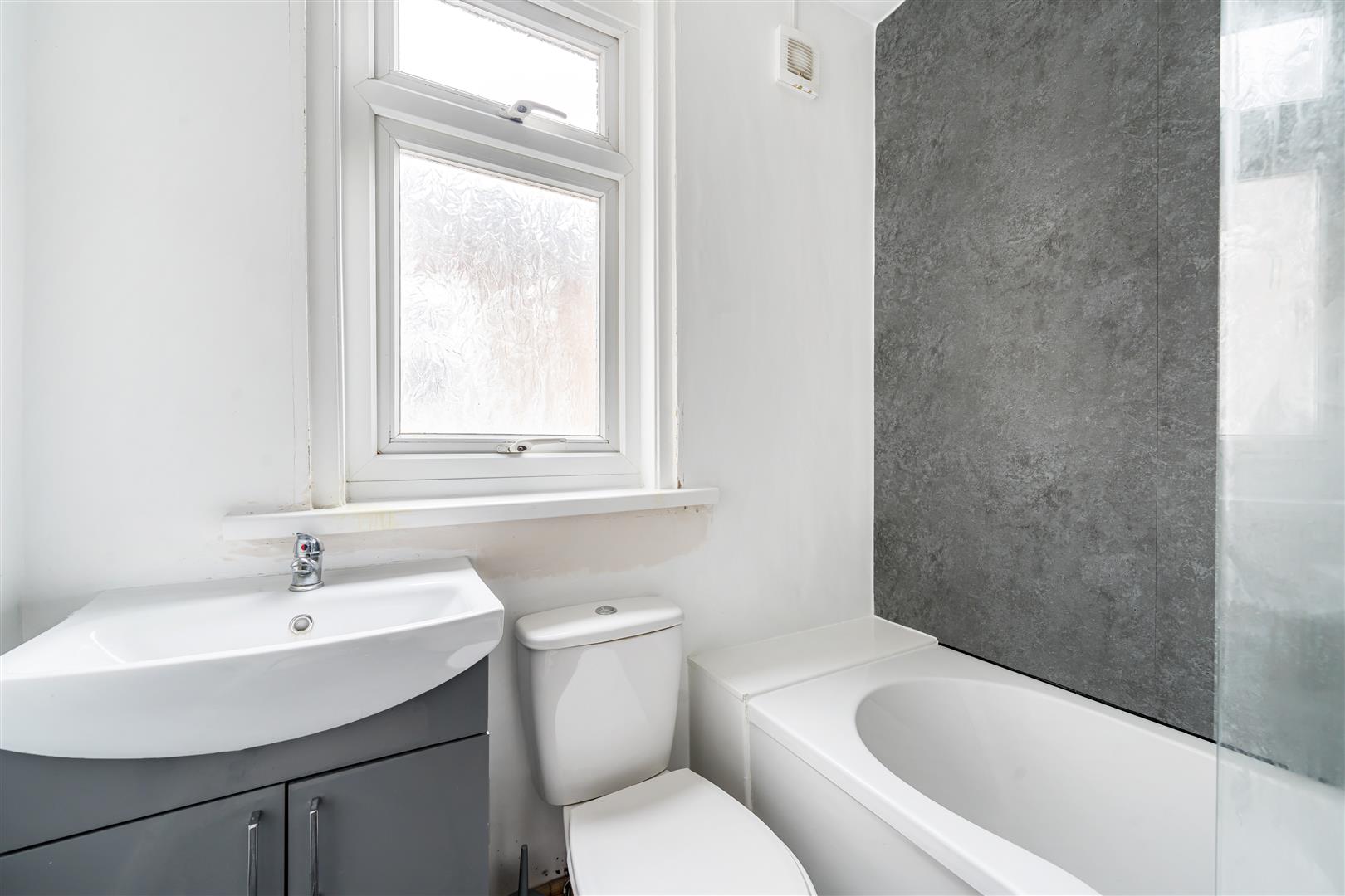 The bathroom is fitted with a bath, a toilet, and a wash basin set within a vanity unit. A frosted window ensures privacy while allowing daylight to brighten the space.