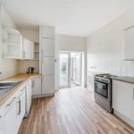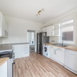 The kitchen is fitted with a range of white base and wall units paired with wood-effect work surfaces, creating a clean and practical space for cooking. It features an integrated oven and hob, a stainless steel sink, and ample room for appliances including a dishwasher and washing machine. Double doors open to the rear garden, providing easy outdoor access and allowing plenty of natural light to fill the room.