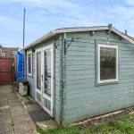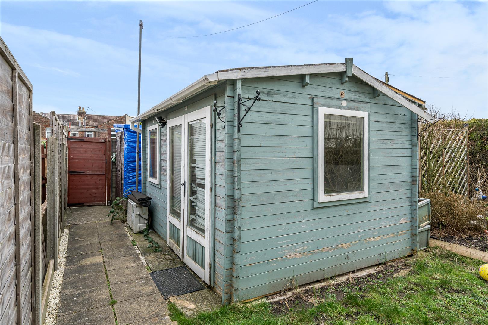 The detached office is a practical outbuilding with double doors and a window, offering a quiet and separate space for work or study.