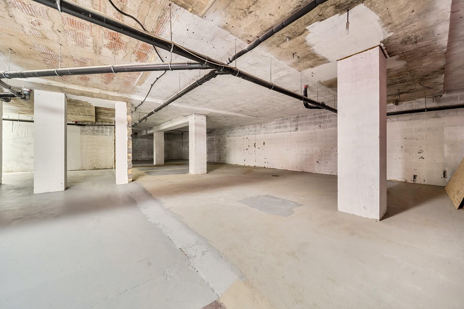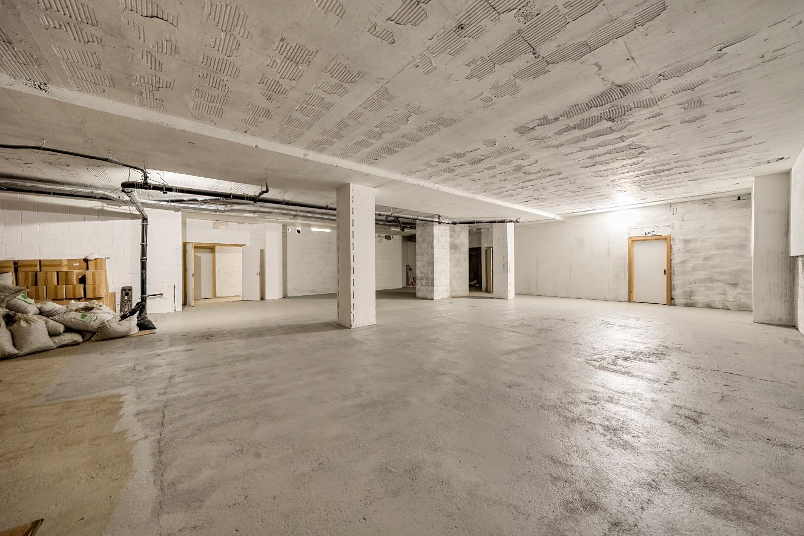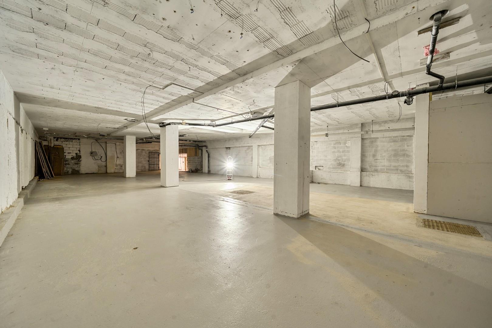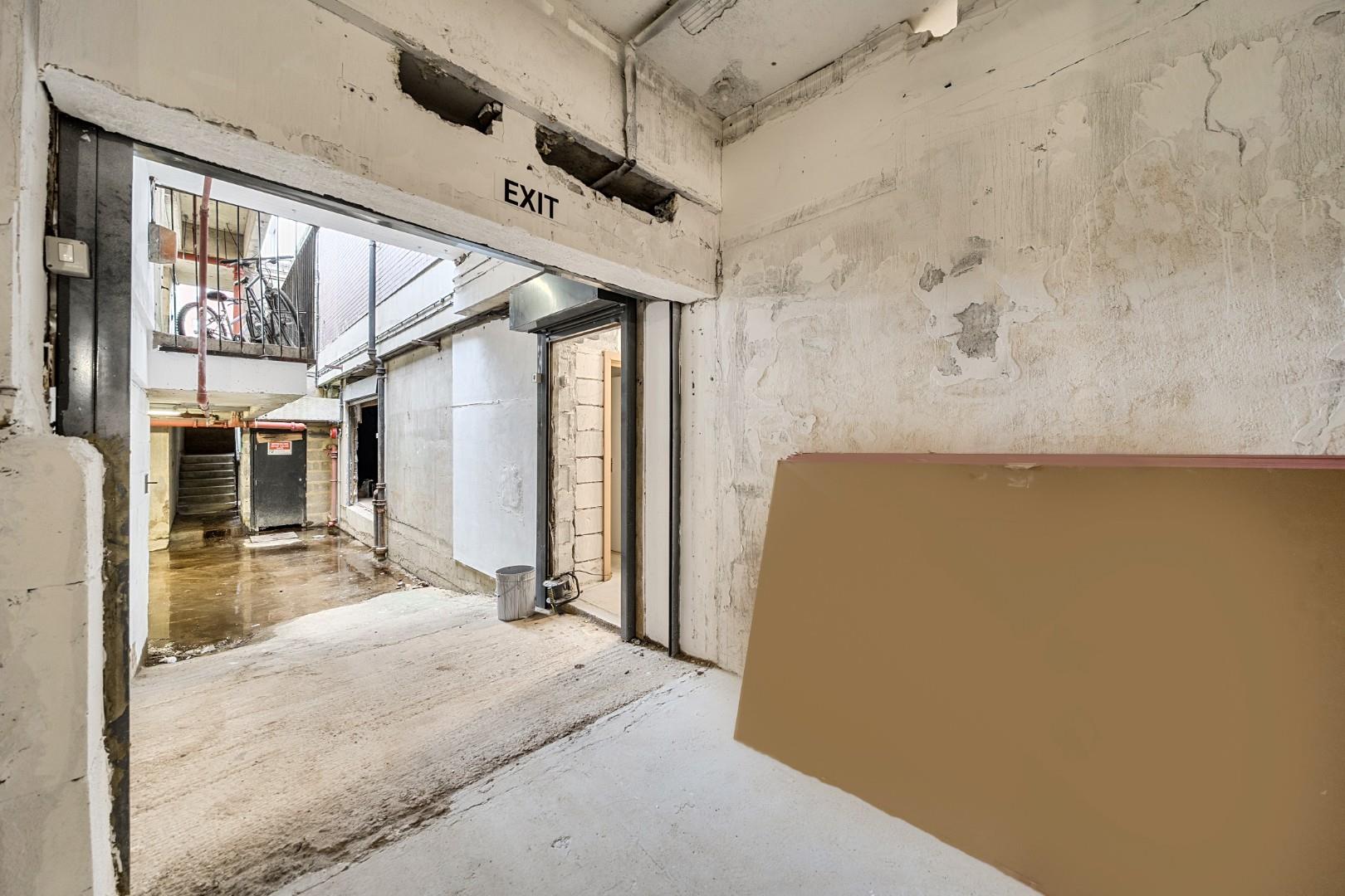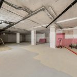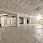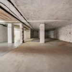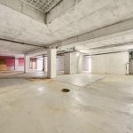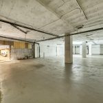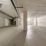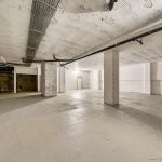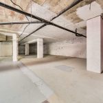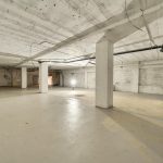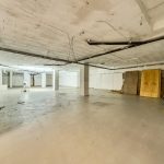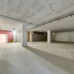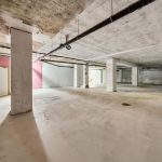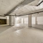 Another large open hall with a concrete floor and ceiling, supported by square columns. The space features wide entrances and exits, some with external access, making it suitable for a variety of commercial or industrial uses. The unfinished walls and ceiling, with visible pipework and wiring, maintain the industrial feel throughout. This area is well illuminated by artificial lighting, enhancing the spacious and adaptable nature of the hall.