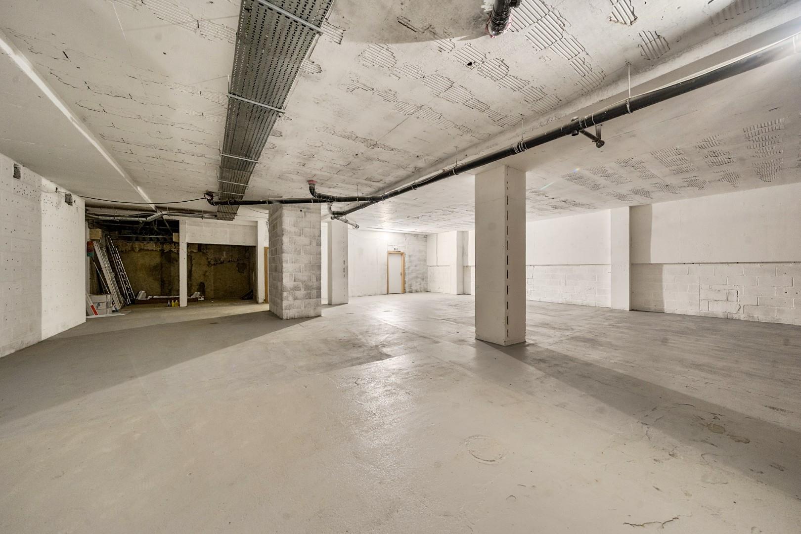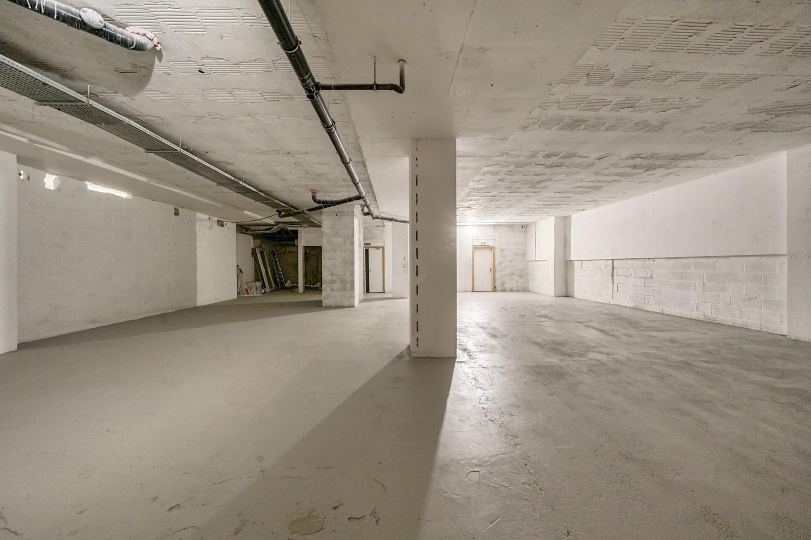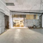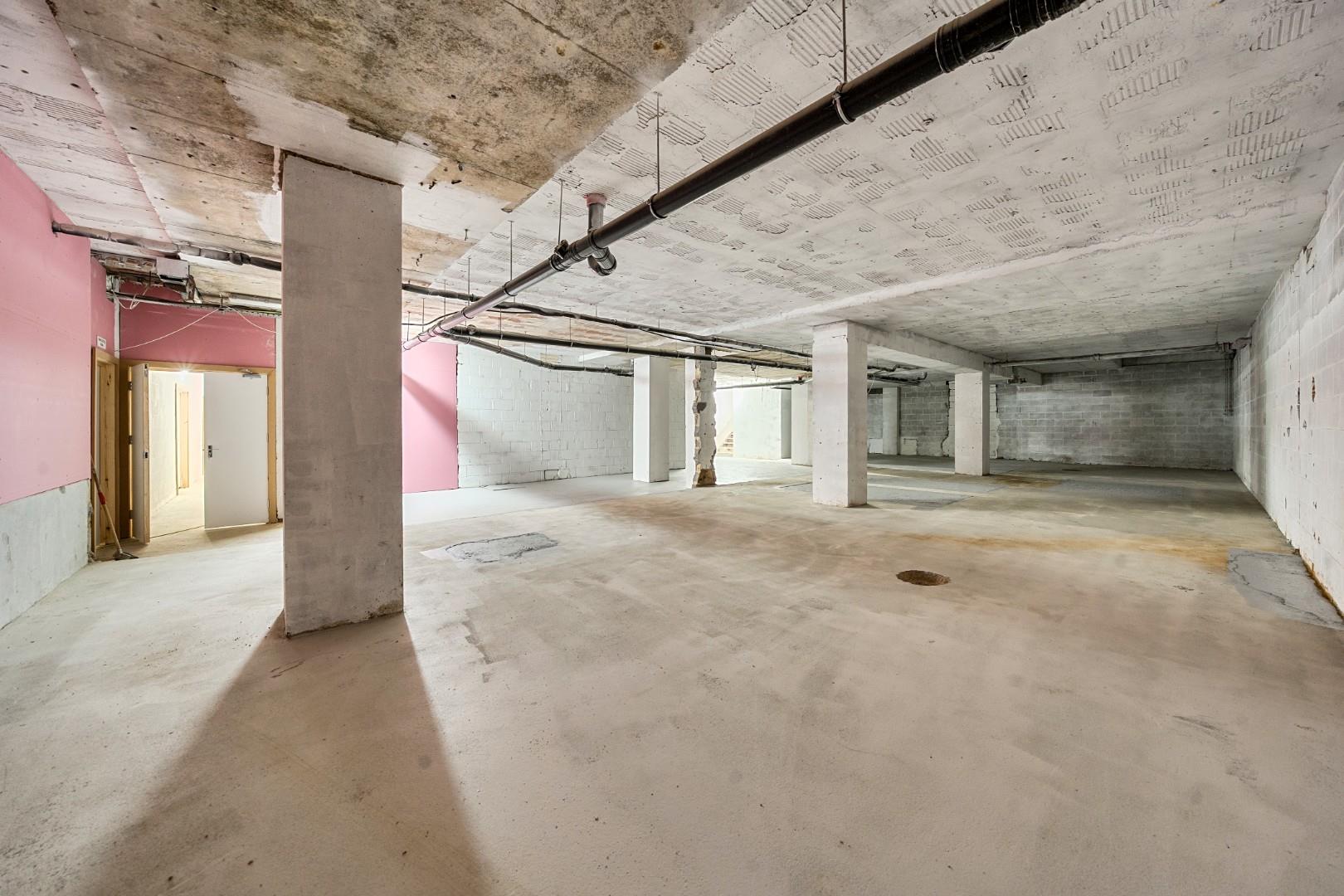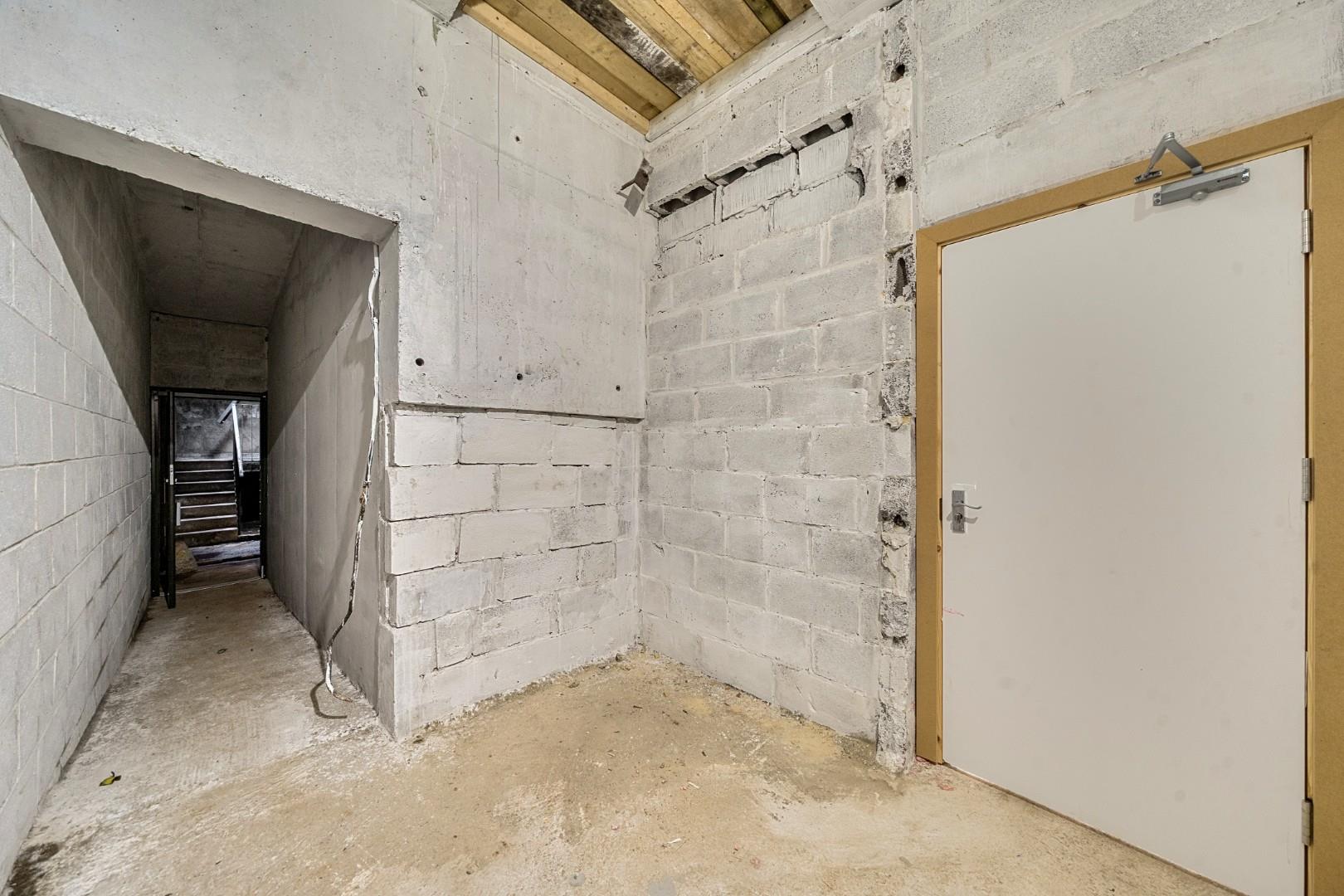 Another large open hall with a concrete floor and ceiling, supported by square columns. The space features wide entrances and exits, some with external access, making it suitable for a variety of commercial or industrial uses. The unfinished walls and ceiling, with visible pipework and wiring, maintain the industrial feel throughout. This area is well illuminated by artificial lighting, enhancing the spacious and adaptable nature of the hall.