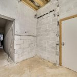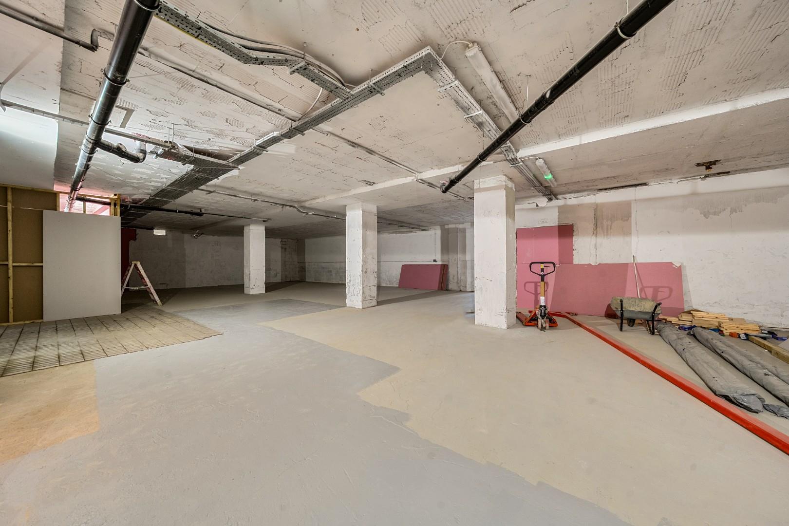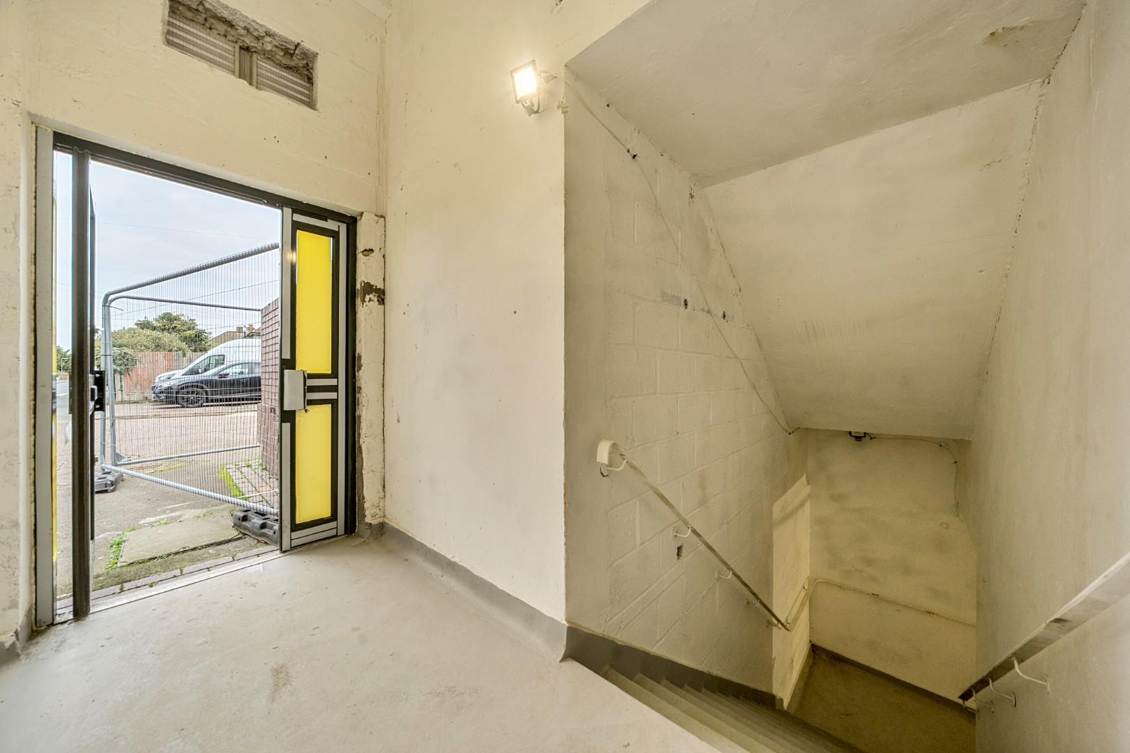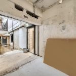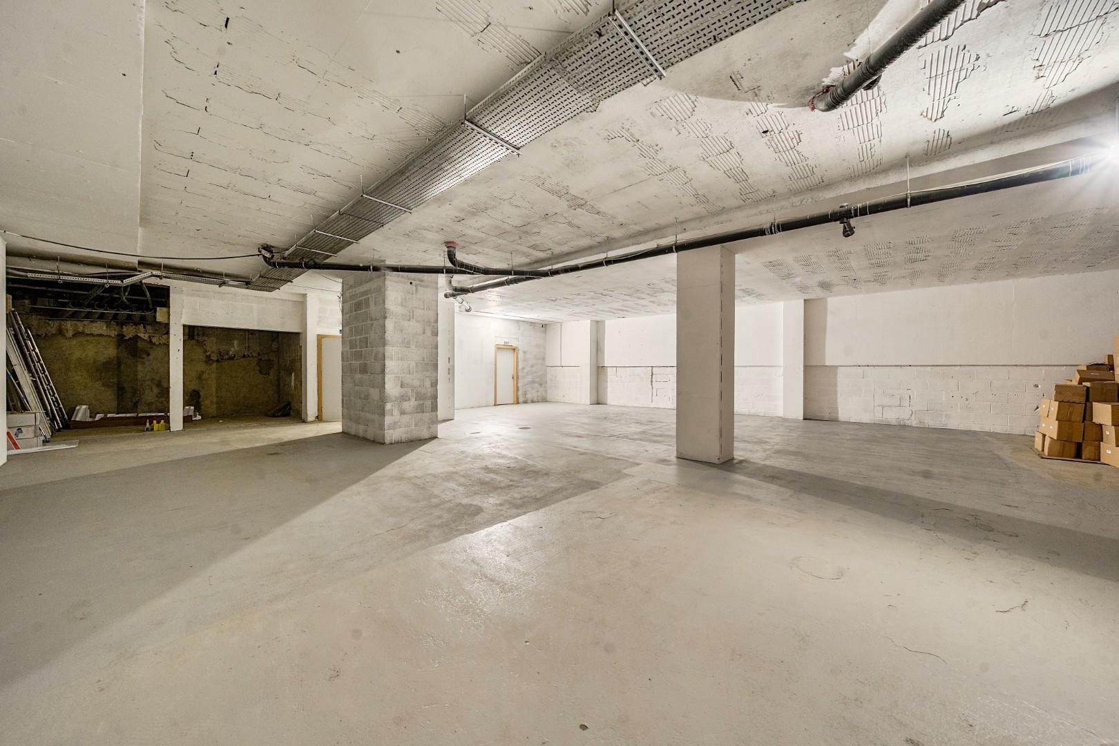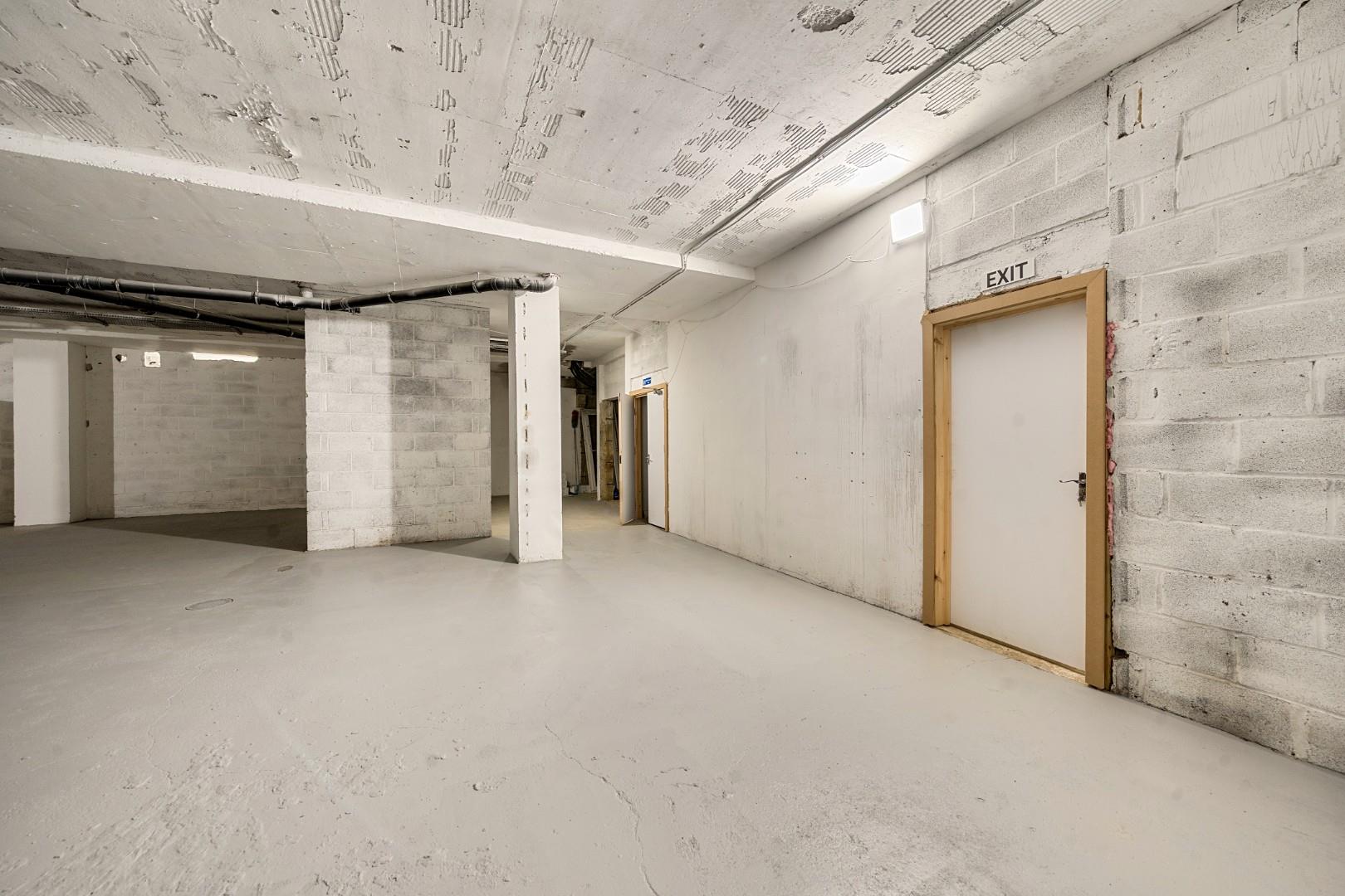 Another large open hall with a concrete floor and ceiling, supported by square columns. The space features wide entrances and exits, some with external access, making it suitable for a variety of commercial or industrial uses. The unfinished walls and ceiling, with visible pipework and wiring, maintain the industrial feel throughout. This area is well illuminated by artificial lighting, enhancing the spacious and adaptable nature of the hall.