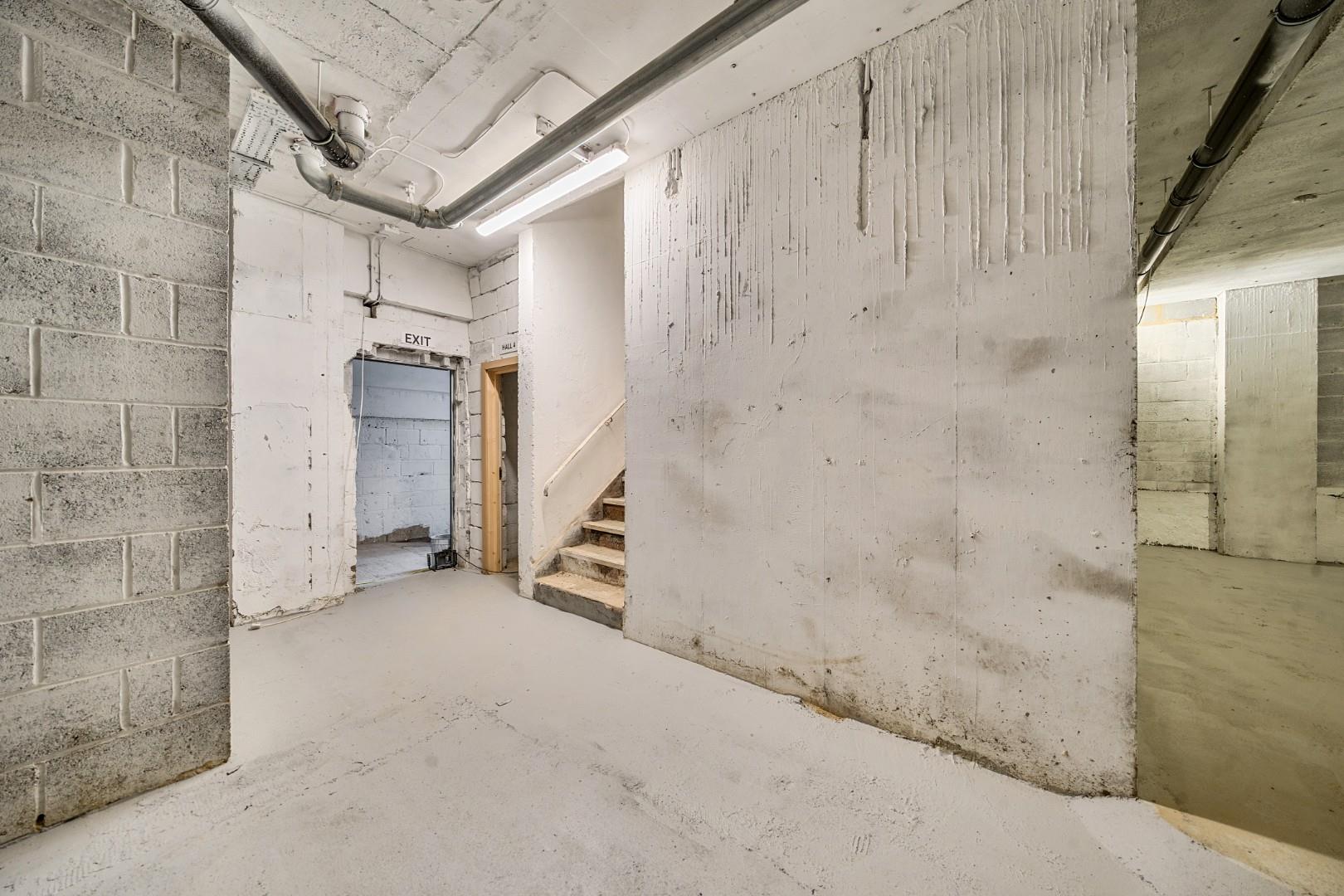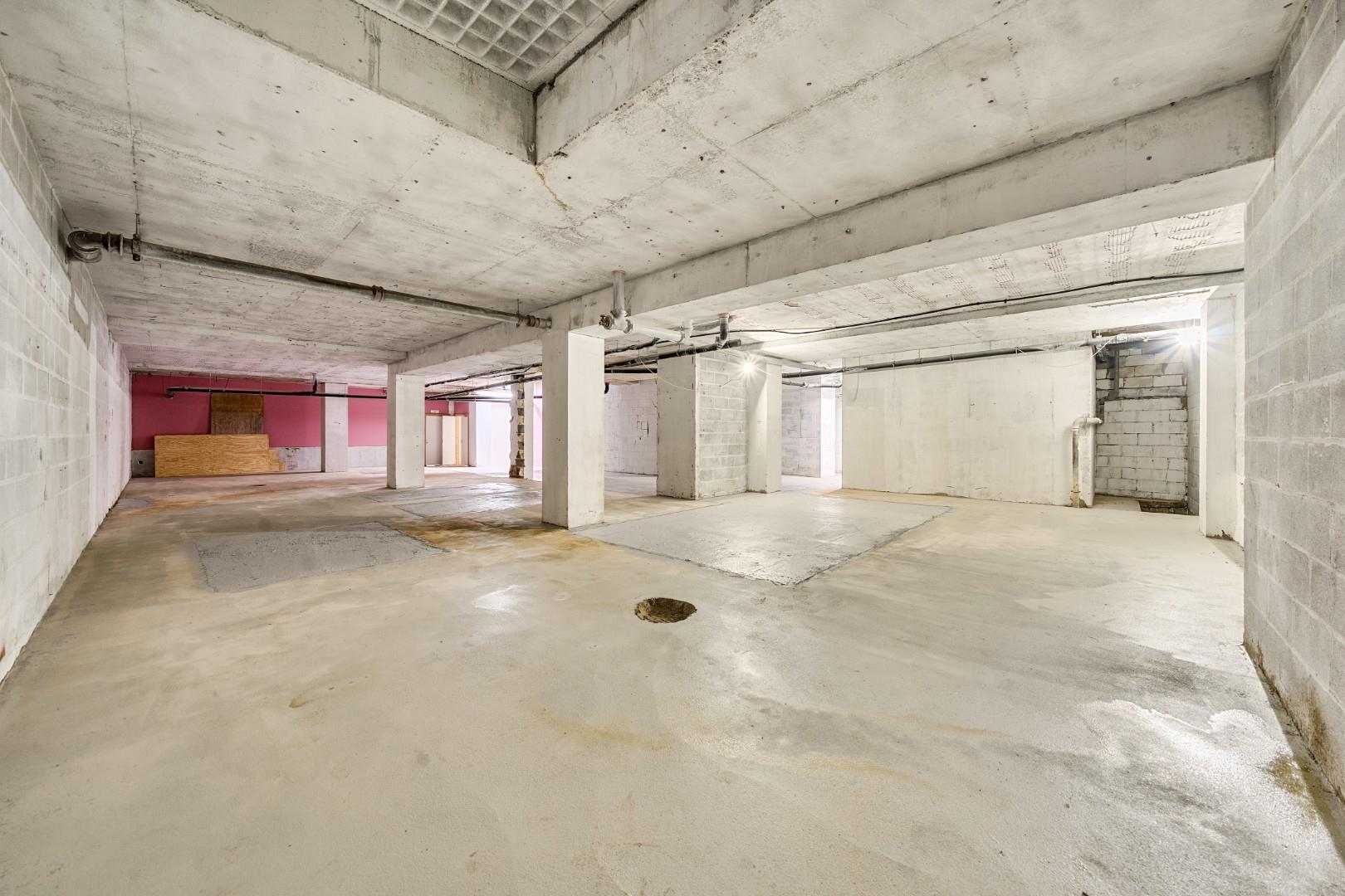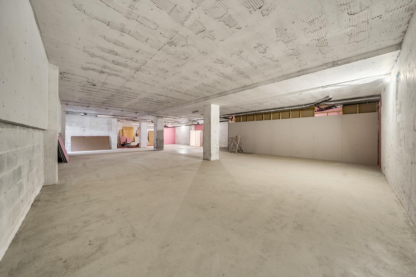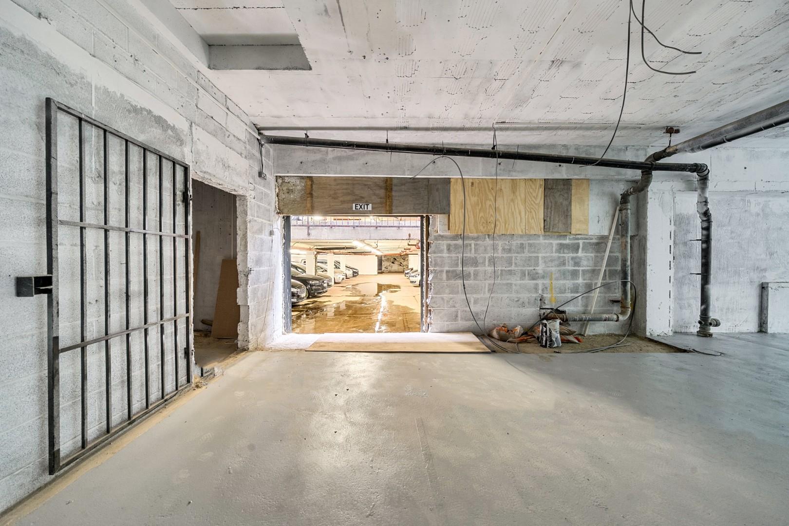 This vast hall features a similar industrial and unfinished style, with concrete flooring and ceiling, and multiple sturdy square pillars supporting the structure. It also benefits from several large openings and doors that link to other areas, including an exit to the outside. The space is utilitarian, well-lit with overhead lighting, and ready to be adapted for a variety of commercial or storage purposes. The exposed pipes and unfinished walls underline the raw character of the hall.
