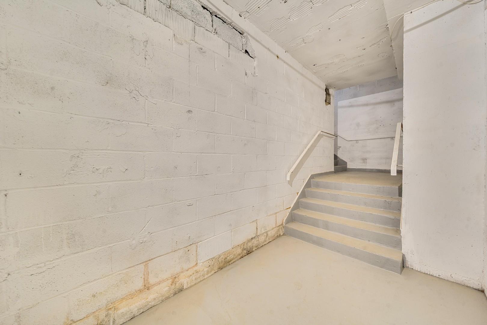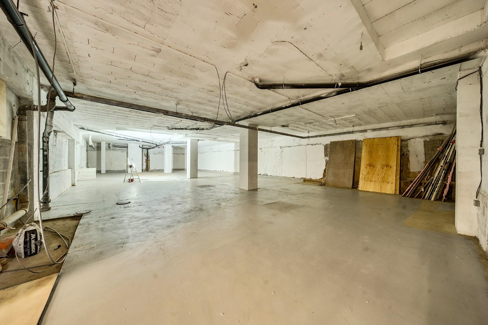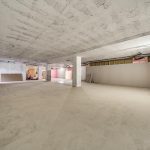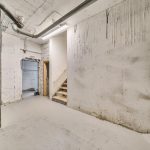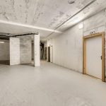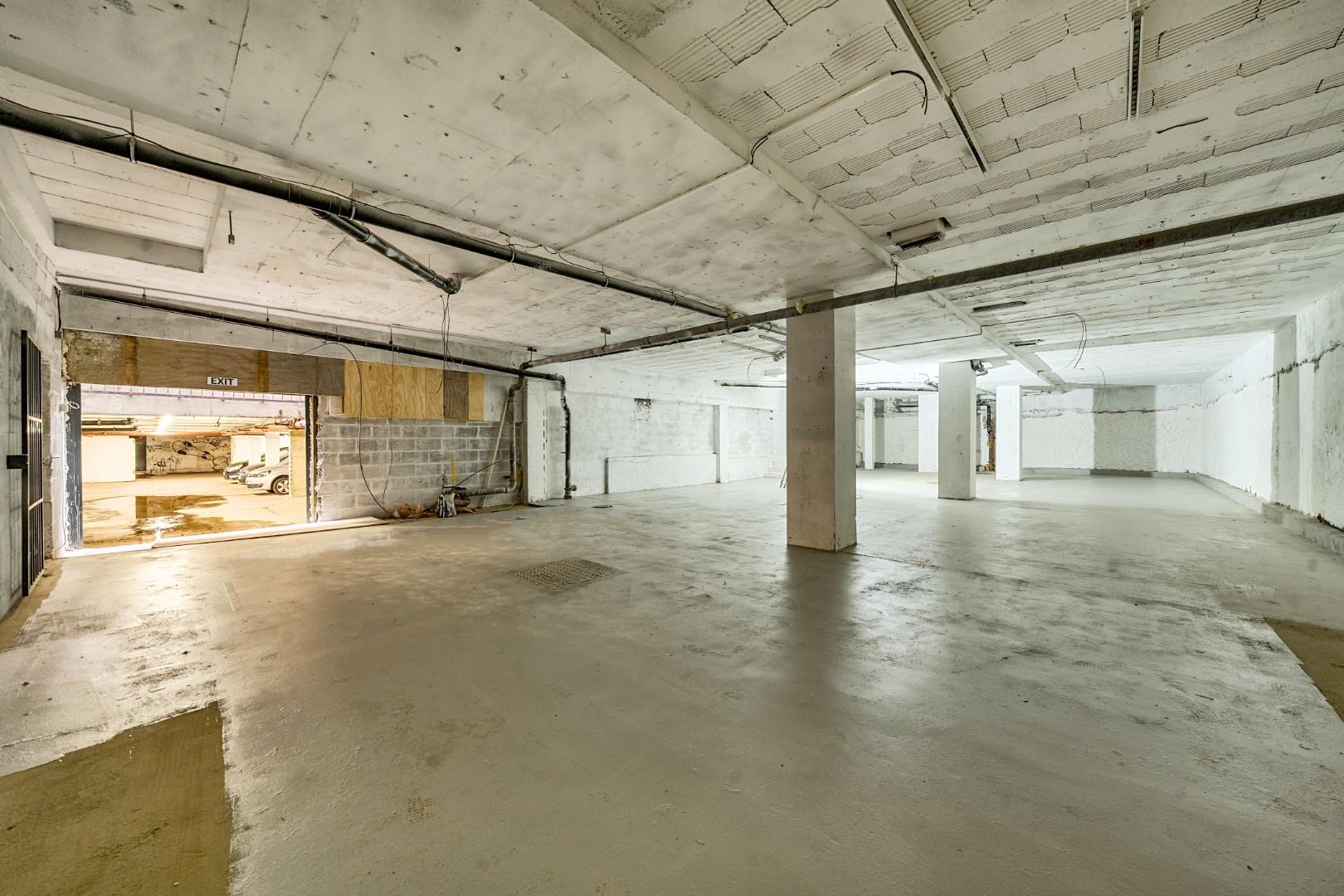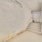 This vast hall features a similar industrial and unfinished style, with concrete flooring and ceiling, and multiple sturdy square pillars supporting the structure. It also benefits from several large openings and doors that link to other areas, including an exit to the outside. The space is utilitarian, well-lit with overhead lighting, and ready to be adapted for a variety of commercial or storage purposes. The exposed pipes and unfinished walls underline the raw character of the hall.