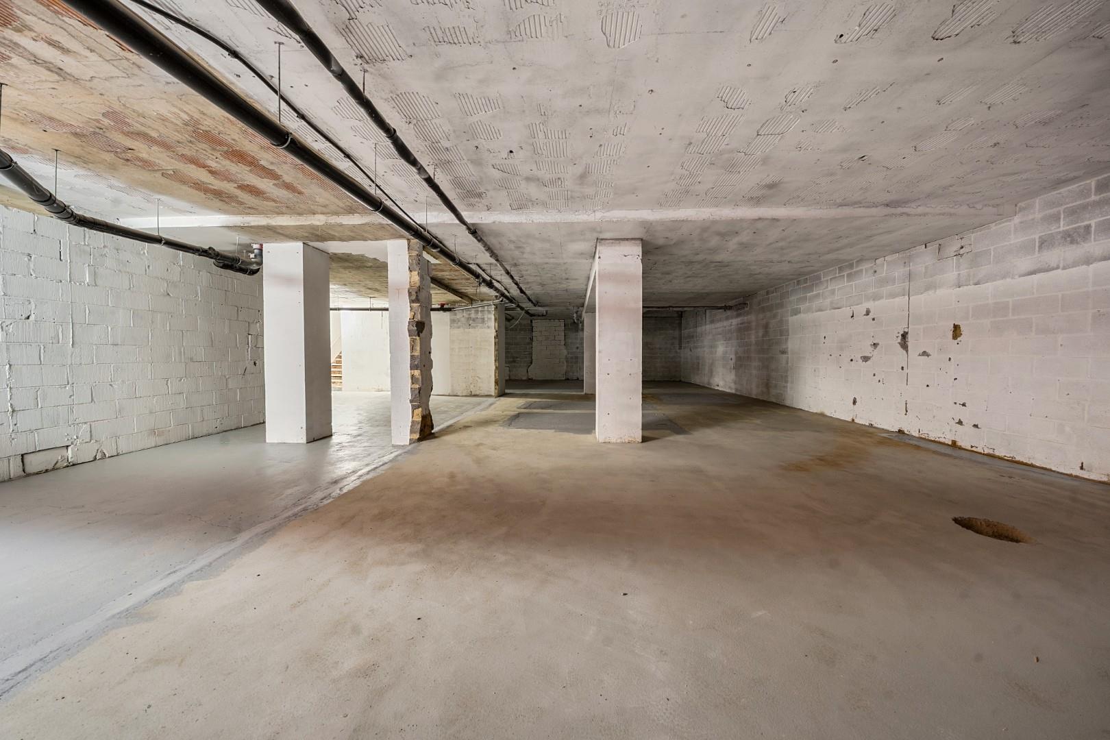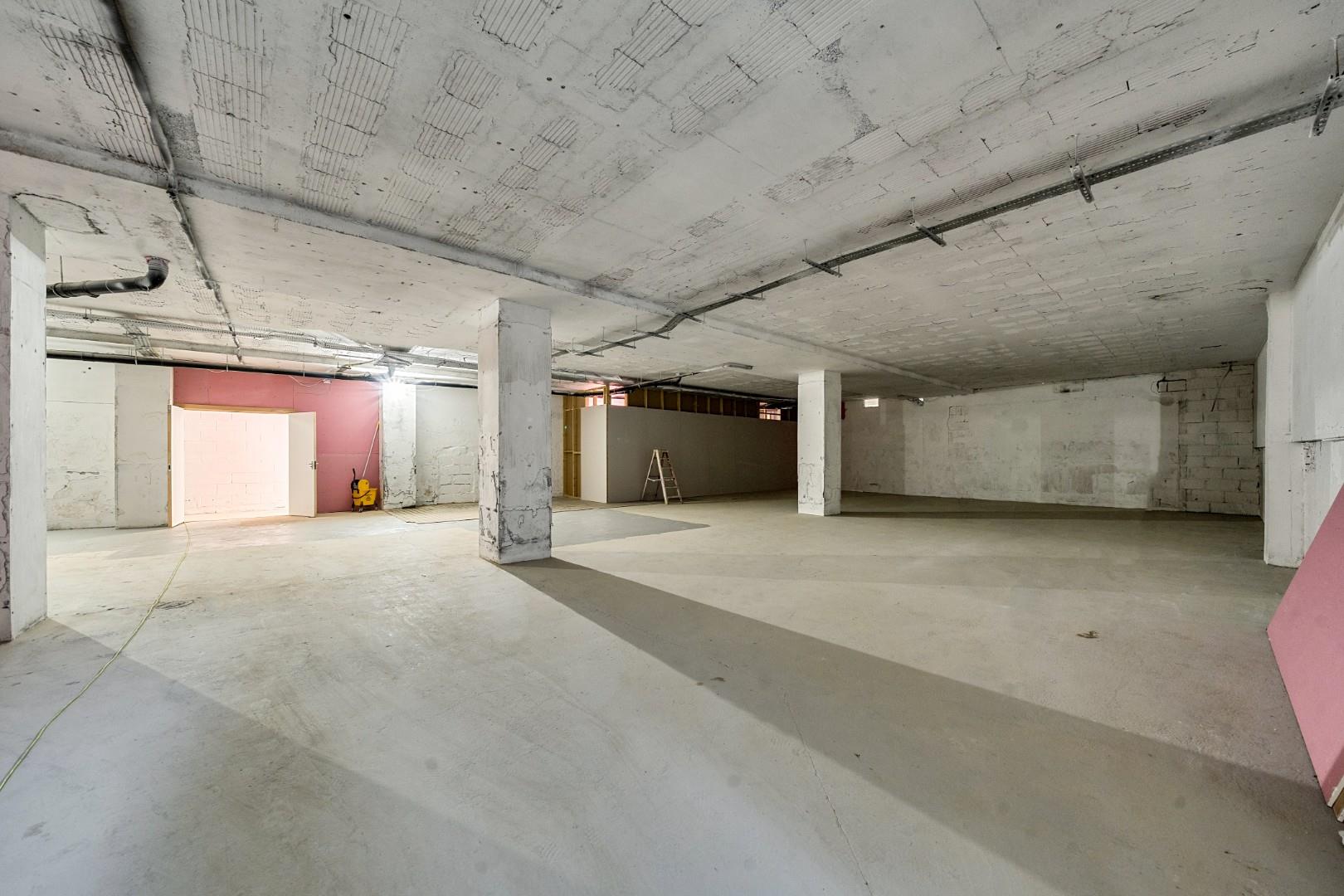 This very large hall is characterized by an open-plan design with a concrete floor and ceiling, supported by multiple square columns. The space is utilitarian and unfinished, with exposed piping and wiring on the ceiling. The hall has wide openings that allow for easy access and movement, suitable for a range of commercial or industrial activities. The lighting is artificial and creates a bright environment despite the industrial nature of the space.