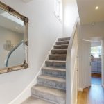 This bright hallway welcomes you with light walls and a generous mirror that reflects the natural daylight. The wood-effect flooring leads smoothly to the stairs, which are carpeted in a soft grey, adding warmth and comfort as you move to the upper floor.