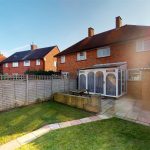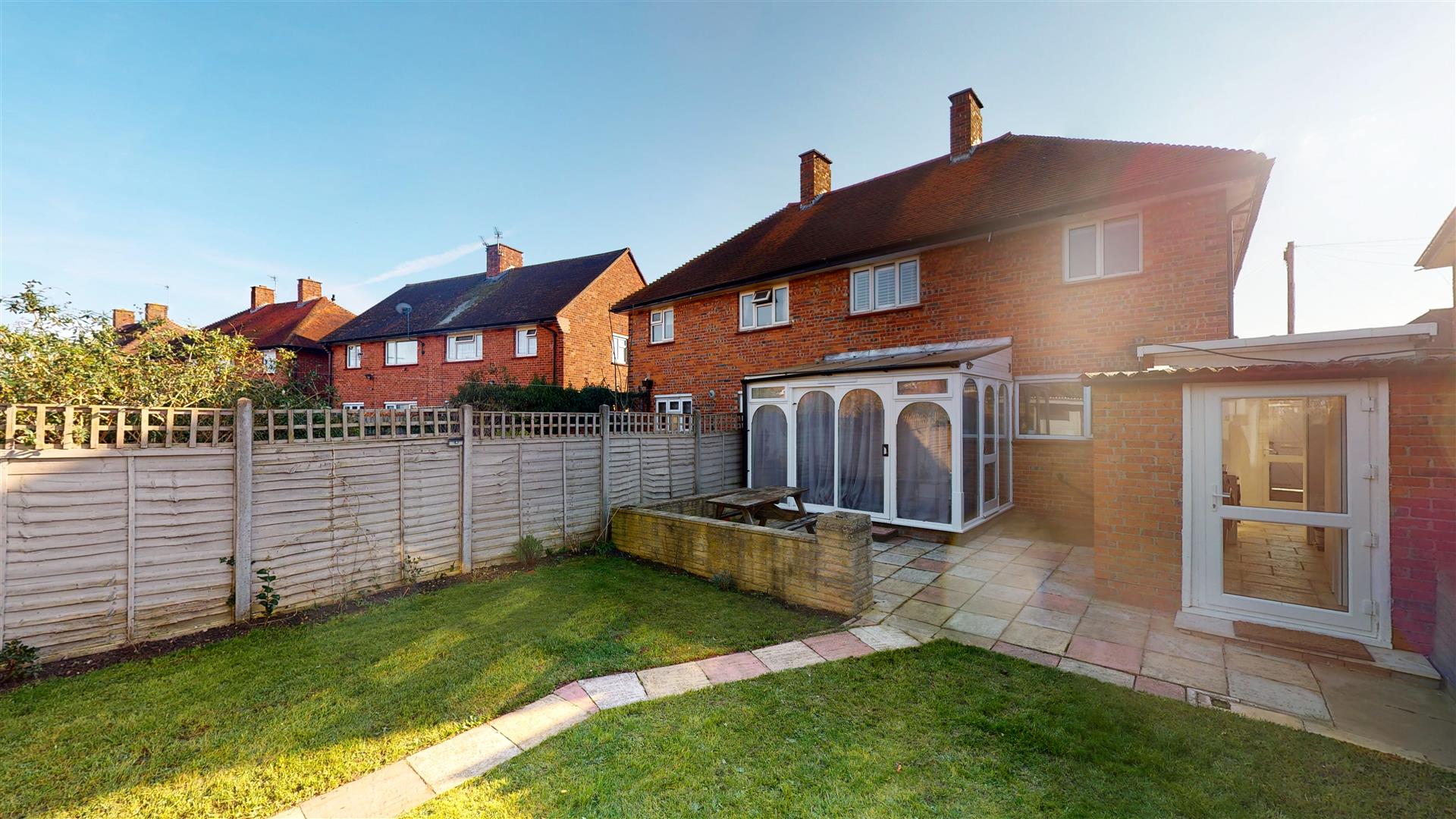 The rear garden is a well-maintained outdoor space featuring a lawn bordered by fencing for privacy. It includes a paved patio perfect for outdoor seating and dining, creating a pleasant area for relaxation and entertaining.