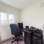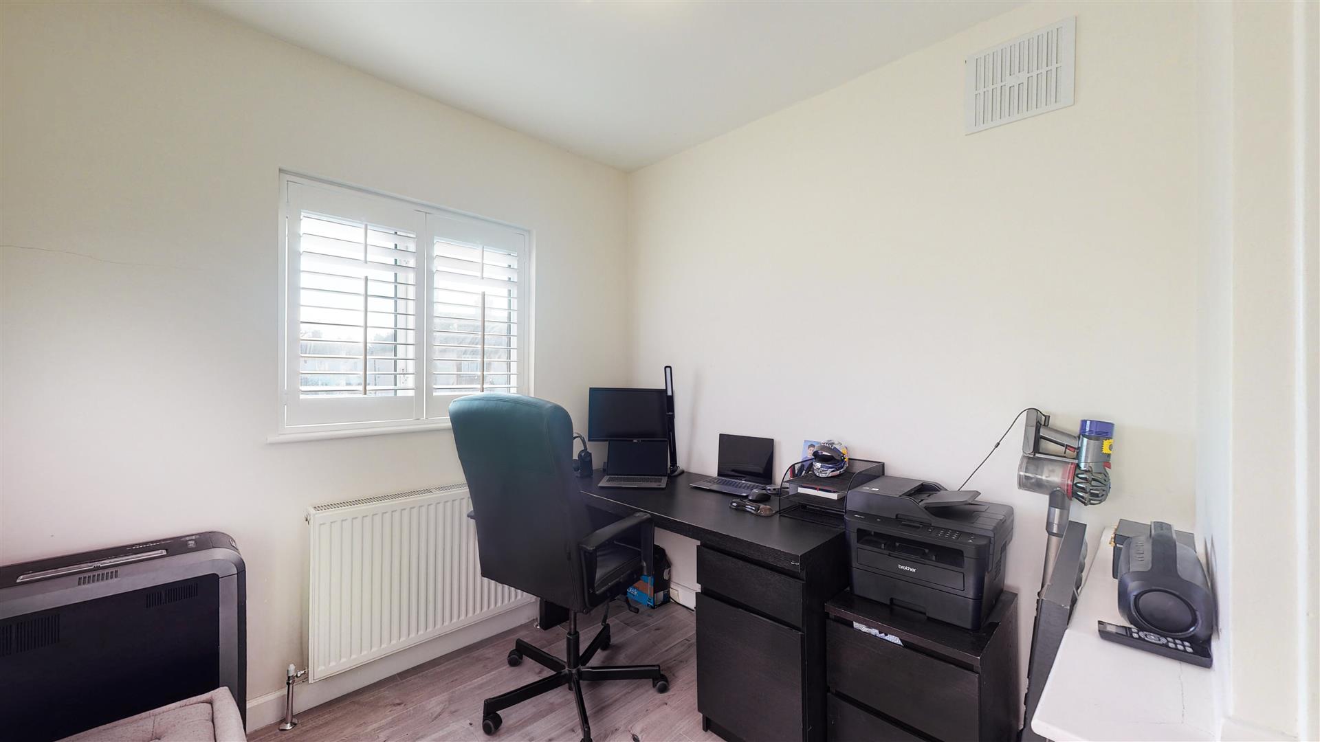 This versatile study is arranged as a home office with a desk and chair positioned by the window, which is fitted with plantation shutters. The room is a quiet space ideal for work or study, finished with neutral walls and wood-effect flooring.
