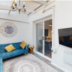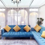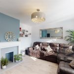 This welcoming living room features a soft natural light that highlights the light wood flooring and a charming fireplace set against a feature wall painted in a calming blue tone. The room provides a comfortable space to relax with a large leather corner sofa and a decorative mirror enhancing the sense of space and light.