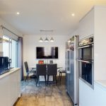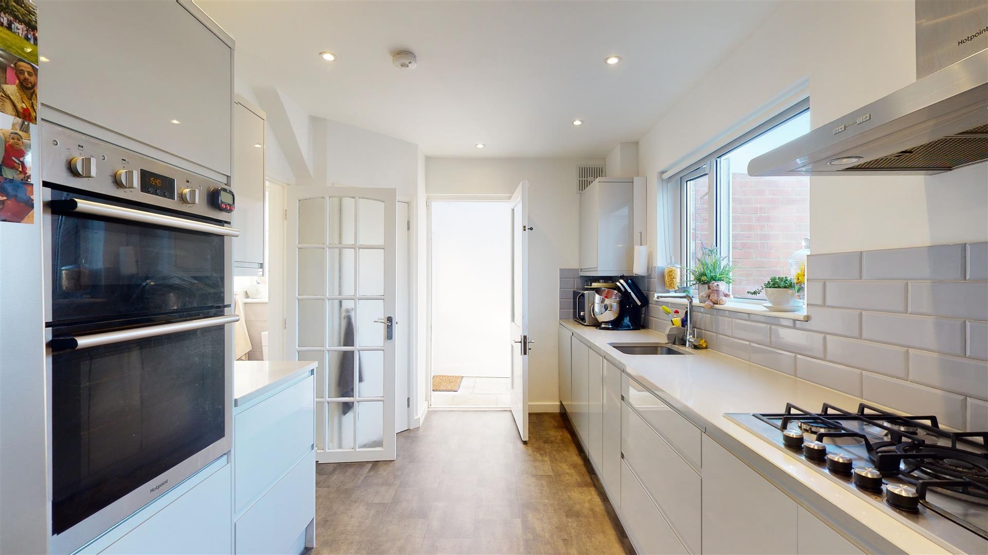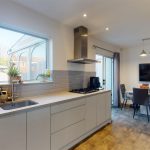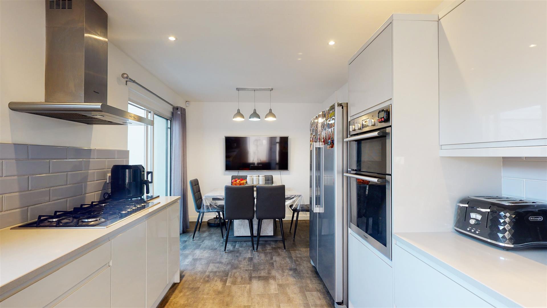 The kitchen is a modern and well-equipped space with sleek, handleless cabinets in a soft grey finish. It includes a built-in oven, a gas hob with a stainless steel extractor hood, and a large window above the sink that fills the room with natural light. The kitchen flows into a dining area with space for a table and chairs, making it a practical and sociable hub of the home.