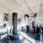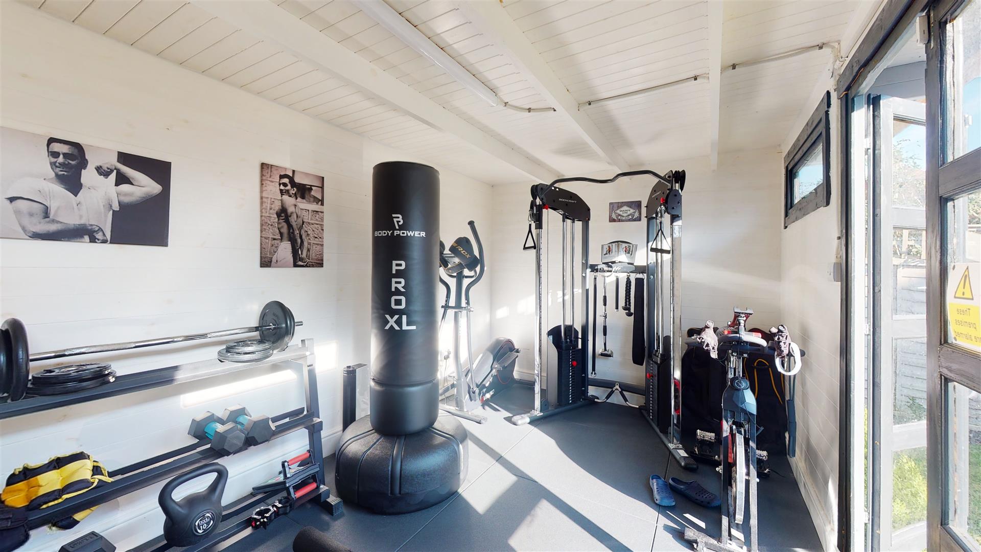 The property includes a dedicated gym in a separate outbuilding, filled with various exercise equipment. This light and airy space has white walls and ceiling beams, providing a practical and motivating environment for workouts.
