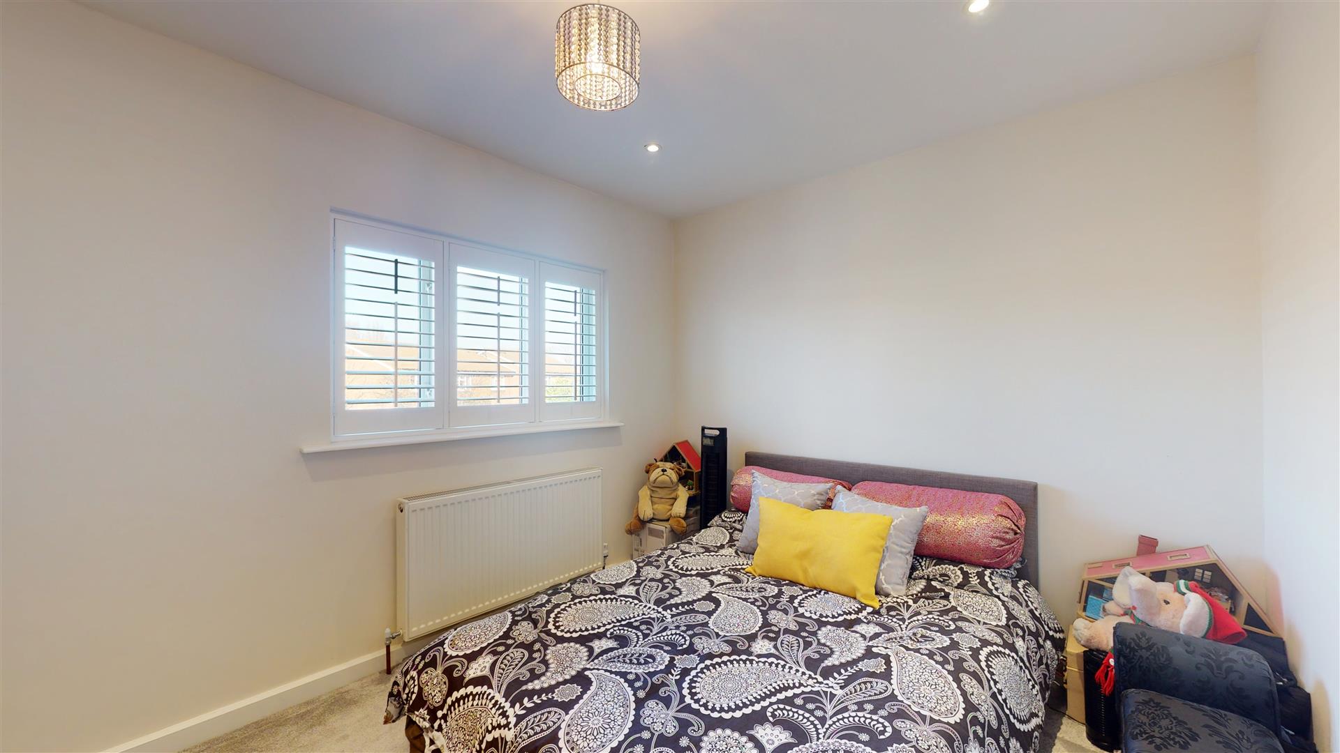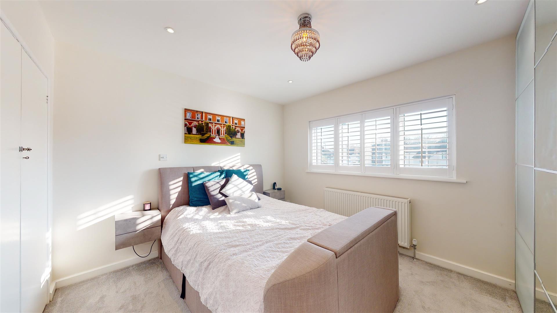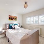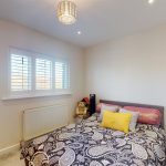 A second bedroom offers a slightly smaller but equally inviting space, with neutral walls and a double bed set beneath a window fitted with plantation shutters. The room is light and airy, suitable for guests or family members.