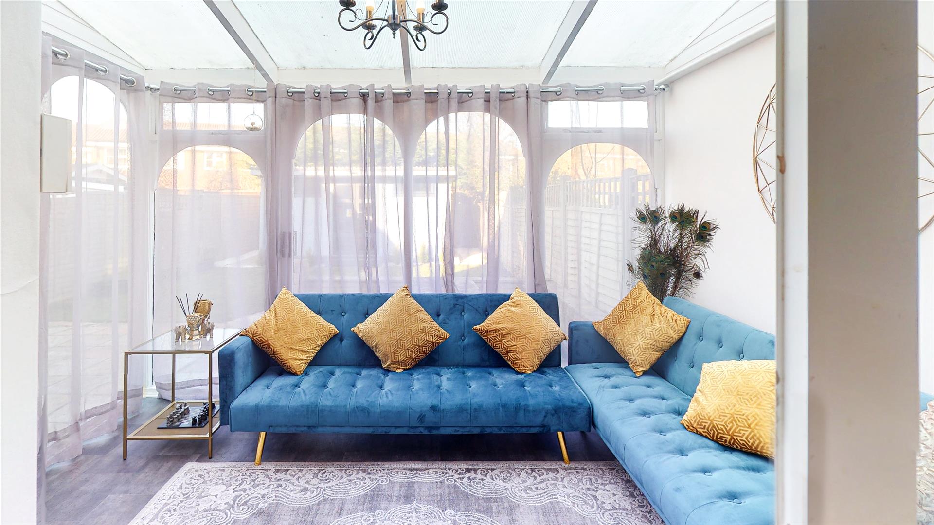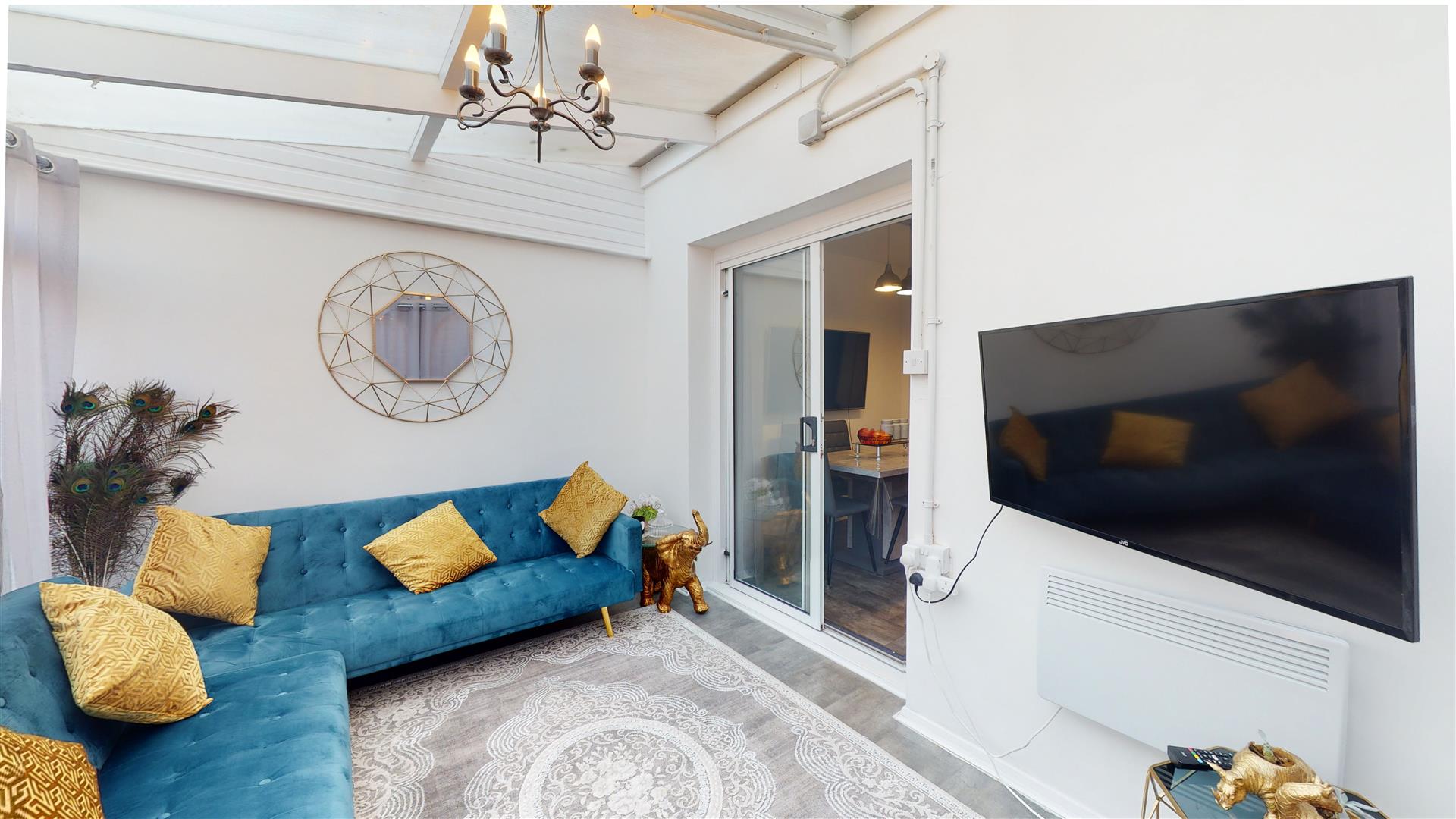 The screened porch is a bright and inviting space enclosed with glass panels and topped with a transparent roof, flooding the room with natural light. It is comfortably furnished with a plush blue L-shaped sofa adorned with warm mustard cushions and a wall-mounted television, making it a versatile area to enjoy throughout the year.