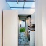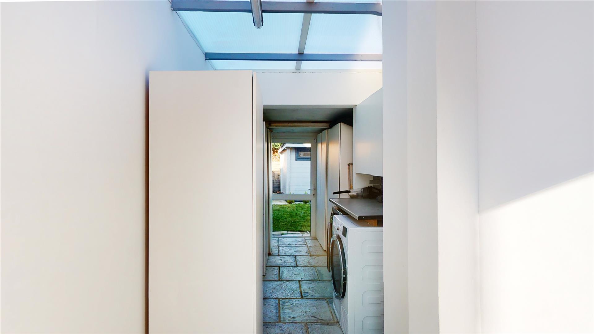 The utility room provides practical space for laundry and storage, featuring a washing machine and additional cupboard storage. It opens out to the garden, with a covered connecting area ensuring convenience regardless of weather.