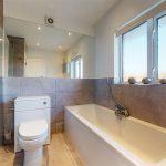 The bathroom is a modern room with a large bathtub, a toilet, and a washbasin. It is tiled in warm, natural tones and features a frosted window for privacy, making it a bright and practical space for daily use.